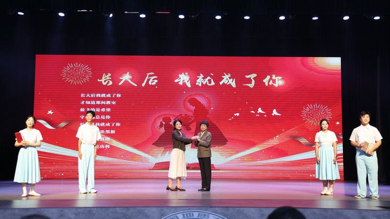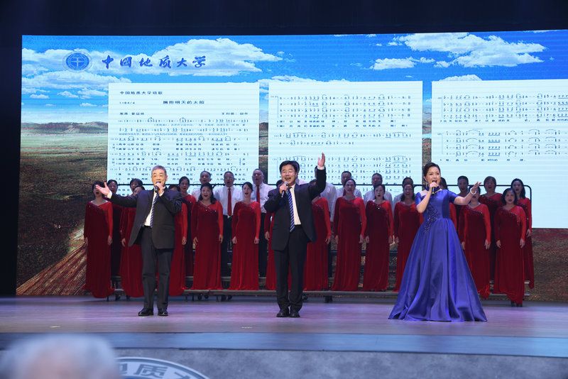 1988届毕业生王利田、1986届毕业生吴太山、2013届毕业生姜力维、校工会教职工金钉子合唱团共同合唱《拥抱明天的太阳》。他们的歌声激昂有力,充满了对未来的无限憧憬和坚定信念。