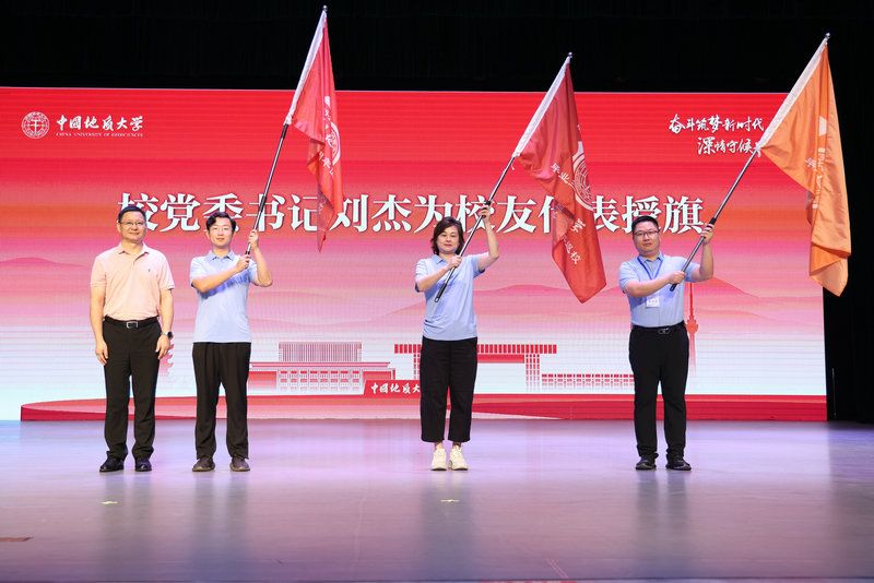 校党委书记刘杰为1995届校友刘京菁、2005届校友黄福海、2015届校友廖昕授旗。