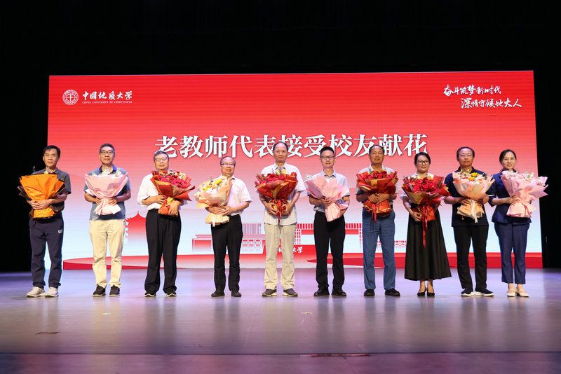 教师代表徐景田、罗文强、朱冬元、张吉军、沈博、佘振兵、陈建平、郭秀蓉、孙华山、徐建梅接受校友献花。