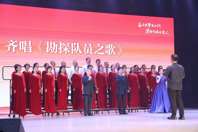 全体人员在艺术与传媒学院余磊老师指挥下齐唱校歌《勘探队员之歌》。