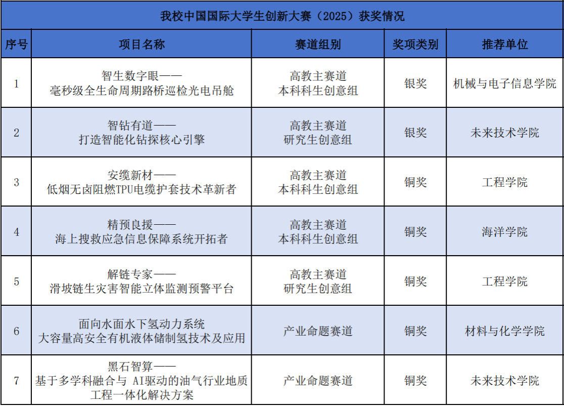 此外,我校《安缆新材——低烟无卤阻燃TPU电缆护套管技术革新者》《精预良援——海上搜救应急信息保障系统开拓者》《解链专家——滑坡链生灾害智能立体监测预警平台》《面向水面水下氢动力系统大容量高安全有机液体储制氢技术及应用》《黑石智算——基于多学科融合与AI驱动的油气行业地质工程一体化解决方案》五个项目斩获铜奖,项目内容涵盖了材料技术、海洋应急、地质灾害监测、氢能应用、油气地质工程等多个领域。