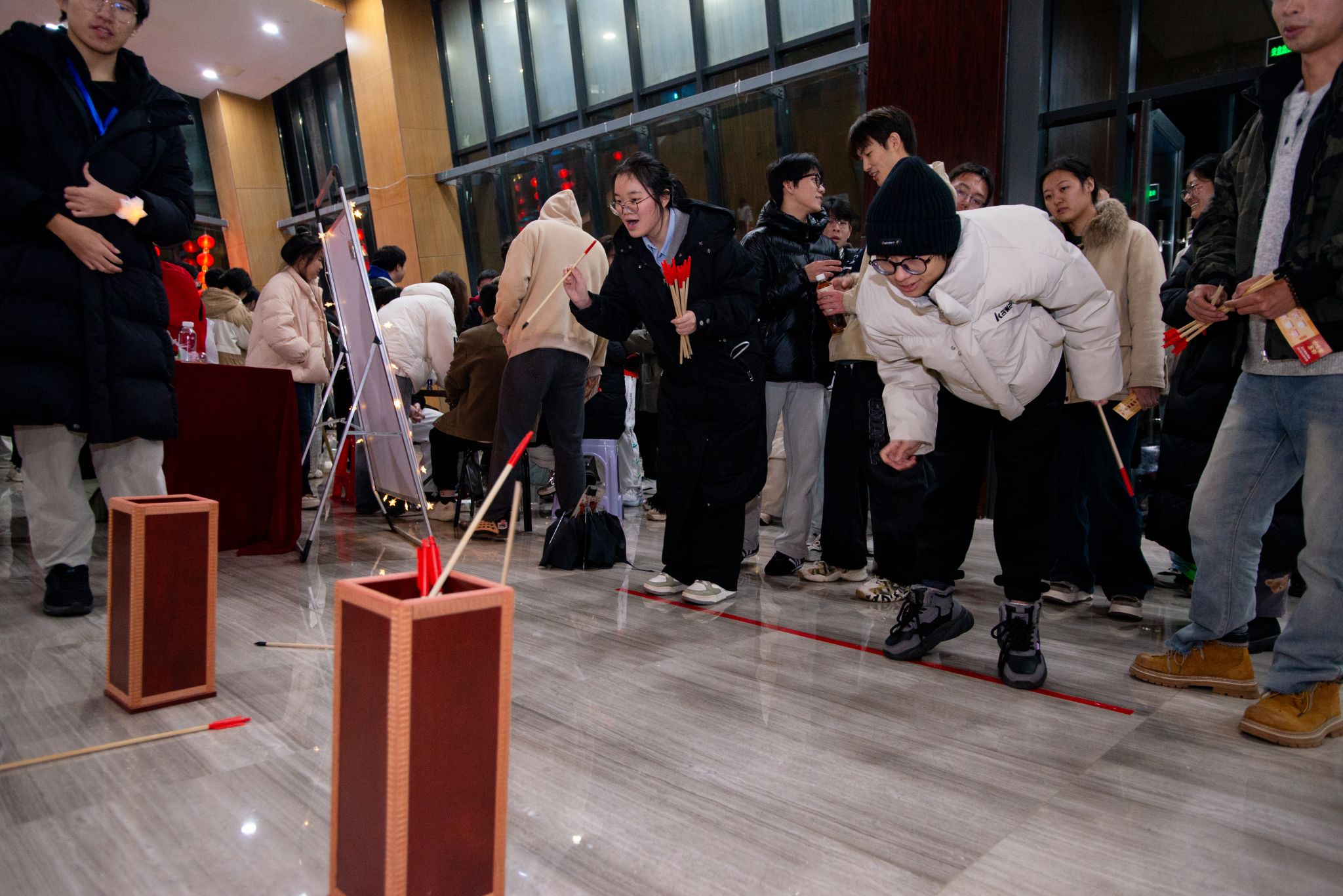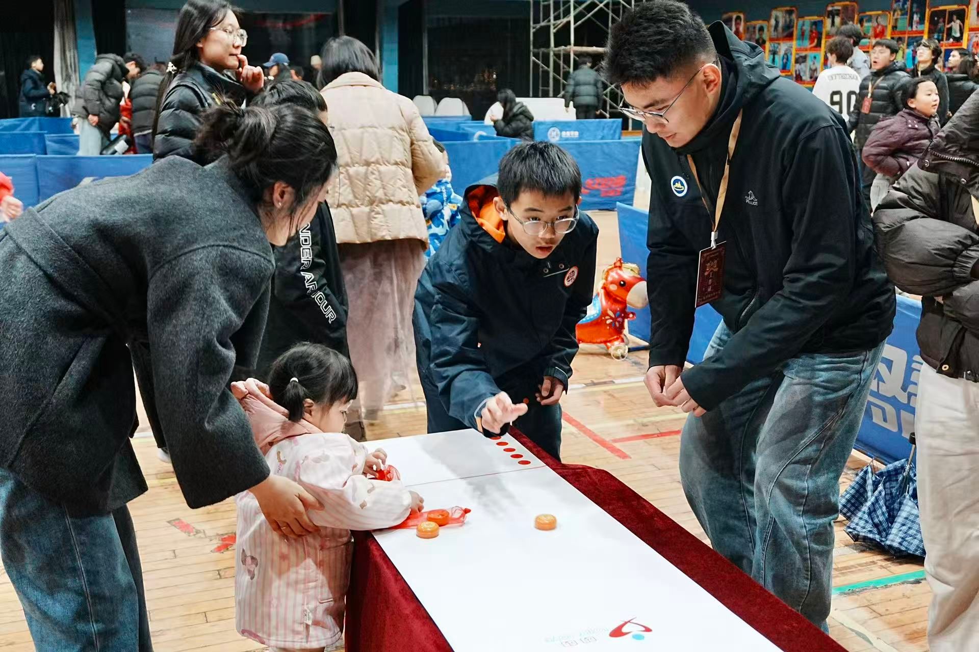 在南望山校区体育馆、未来城校区弘雅堂体育嘉年华现场,师生们自发组队、并肩闯关,蒙眼抓鸡的纯粹欢乐,击鼓颠球、福球接力的团队协作,桌面冰壶的精准博弈,还有投壶的优雅从容……赛场之上,师生同心协力;欢呼之中,凝聚团队朝气。现场还有攀岩、武术和瑜伽表演,精彩纷呈、活力满满。