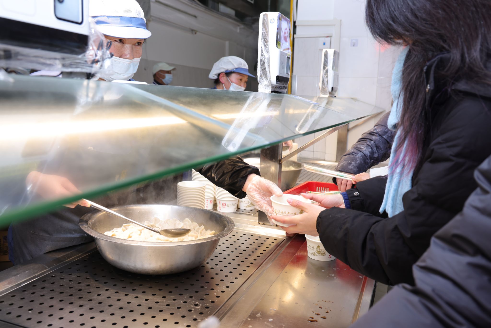 在南望山校区学三食堂,校领导与同学们共同品尝饺子,交流在地大的学习生活感受。学校为两校区同学们免费提供饺子和暖心姜汤,冬日夜晚,温暖直达心底。