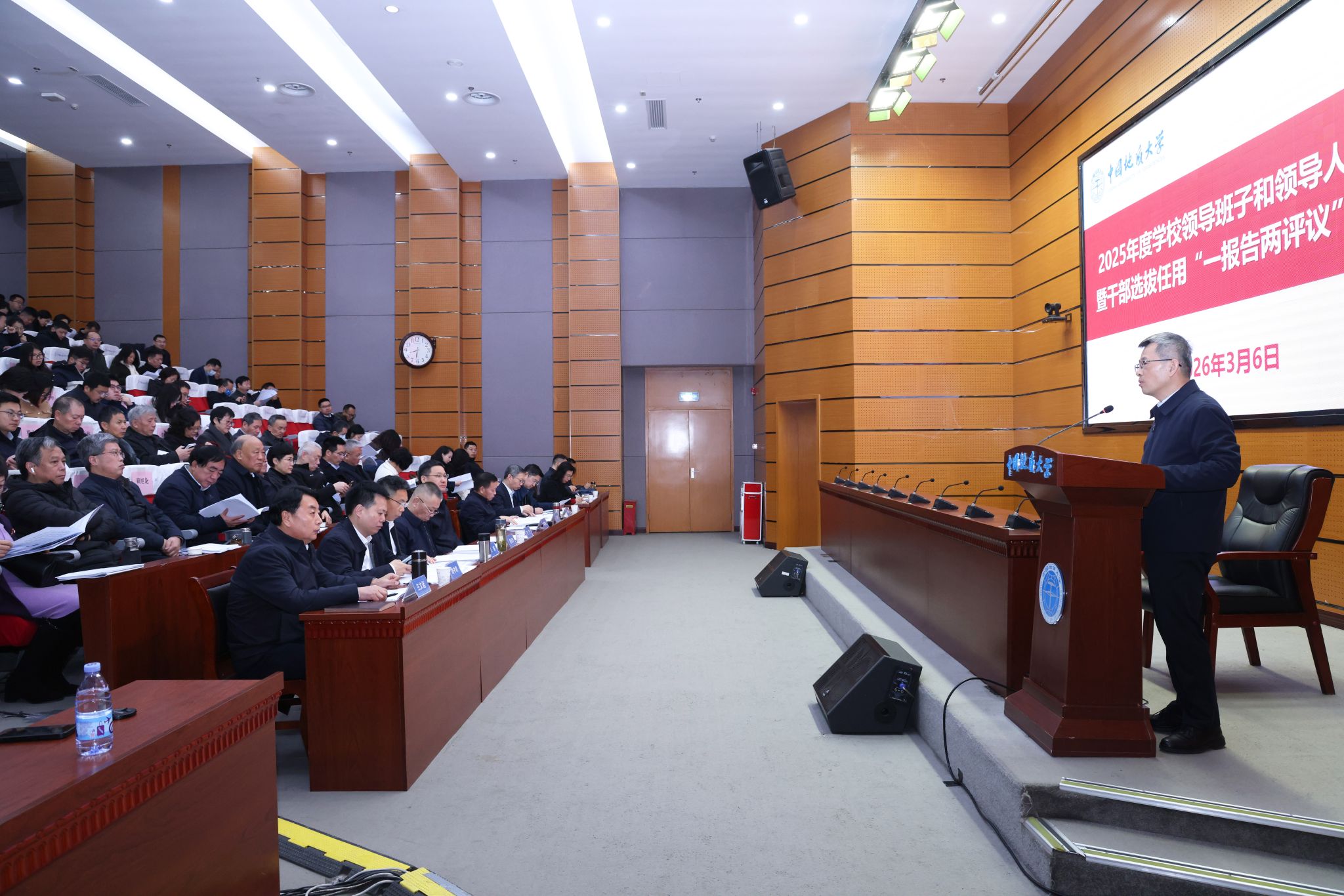 地大新闻网讯(通讯员 郭倩 吴妍 摄影 孙彦钦)3月6日,2025年度学校领导班子和领导人员考核及干部选拔任用“一报告两评议”工作会议,在南望山校区东区教学综合楼A0113会议室召开。全体校领导,党委常委,校长助理,管理服务机构和教学科研单位全体中层干部,直属单位主要负责人,“两代表一委员”代表、民主党派及无党派人士代表、离退休教职工代表、教师代表及学生代表参加会议。校长、党委副书记李建威主持会议。