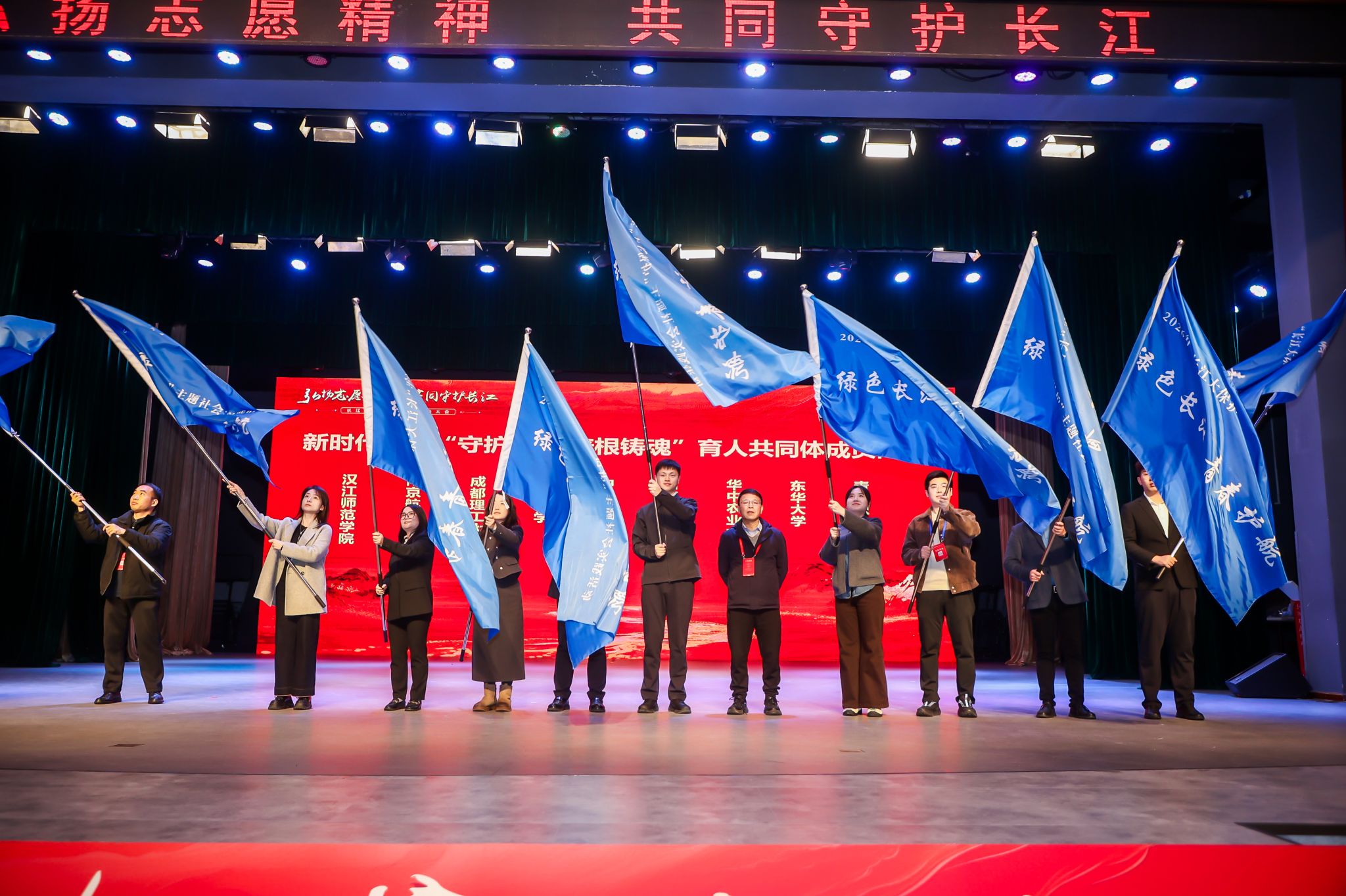 在教育部思政司指导下,由我校牵头成立的新时代高校“守护长江 培根铸魂”育人共同体,在大会上举行成员单位高校社会实践团出征授旗仪式。来自长江上中下游沿线的9所高校学生代表接过旗帜,未来他们将奔赴流域各地开展生态调查、科普宣讲与志愿服务,以青春力量接续守护长江,标志着高校系统化、组织化投身长江大保护事业进入新阶段。