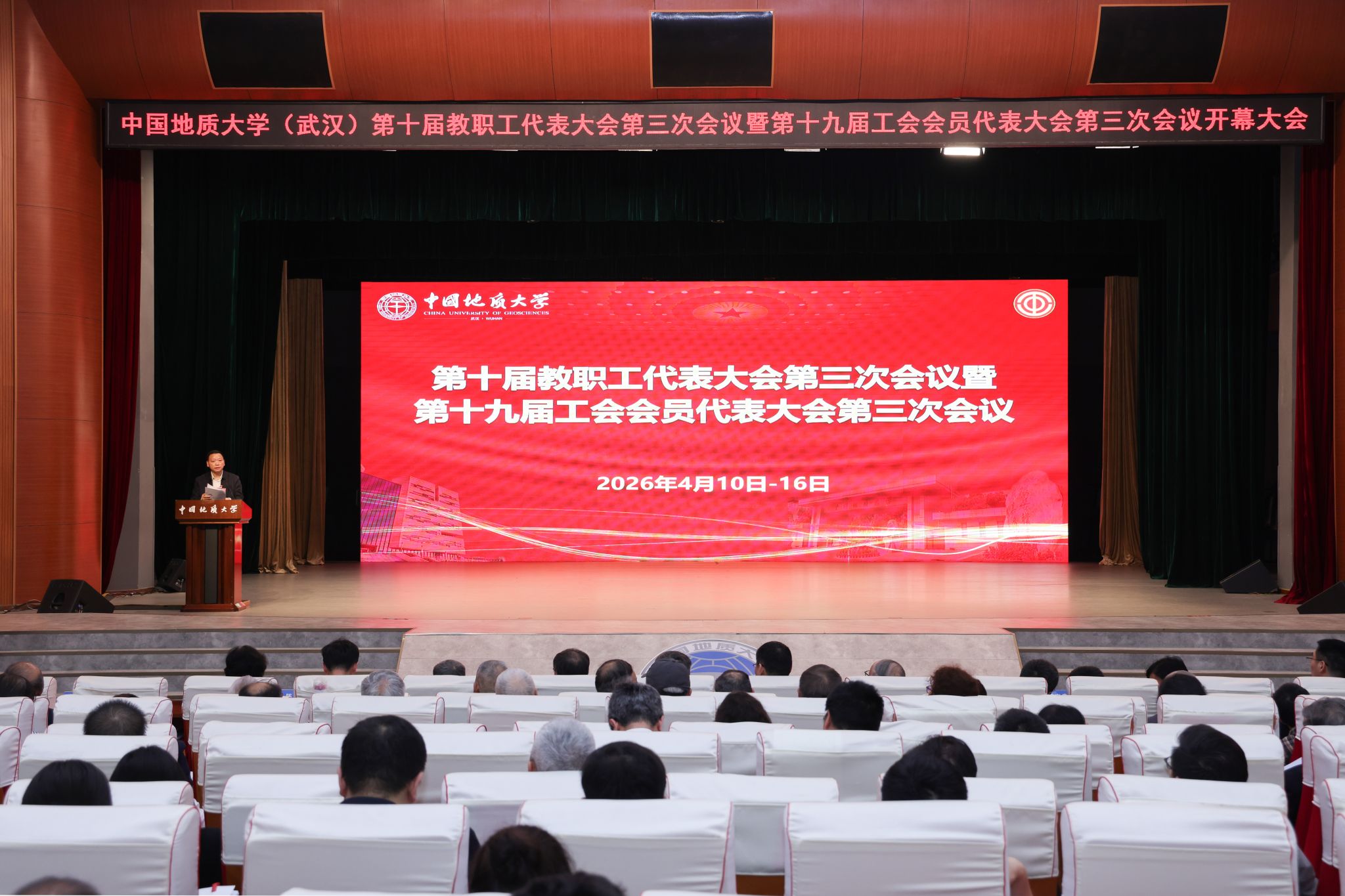 地大新闻网讯(记者 焦思勤 李锐欣)4月10日,中国地质大学(武汉)第十届教职工代表大会第三次会议暨第十九届工会会员代表大会第三次会议在南望山校区弘毅堂召开。在校校领导,院士,党委常委,校长助理,全体正式代表、列席代表、特邀代表等300余人参加。大会执行主席、校党委副书记王林清主持会议。