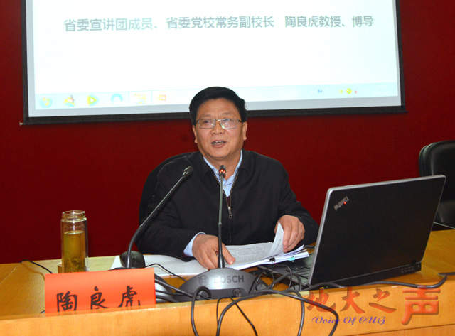 (记者徐燕 摄影张玉贤)1月11日,省委宣讲团到我校宣讲省委十届七次全会精神。省委宣讲团成员、省委党校常务副校长陶良虎作宣讲报告。在校校领导,各分党委(总支)书记、副书记,各职能部门、群团组织、直属单位处级干部,机关科级干部等听取了报告。