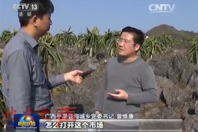 《新闻联播》报道曾维康视频截图 (通讯员张祎)1月12日,中央电视台新闻联播《治国理政新实践.脱贫军令状》栏目播出《精准扶贫:扶贫产业如何长效?》,报道了我校工商管理专业2004级校友、广西平果县海城乡党委书记曾维康扎身基层、服务脱贫的事迹。