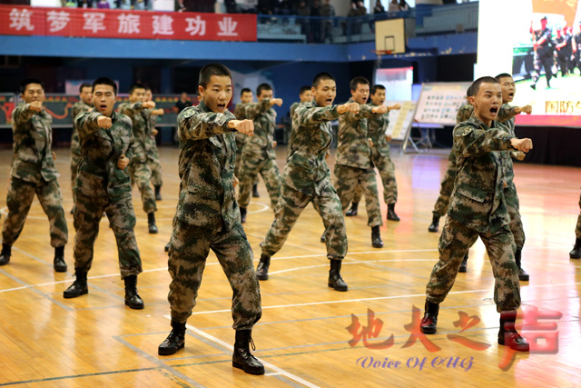 当天下午,在西区体育馆进行了国防生综合素质展示。我校全体国防生进行了队列操、体能操、擒敌拳、格斗表演,并当场演示“三分叠七分整”的四方被,诠释了严格专业的日常军事训练。接下来的军事文化表演中,威风锣鼓、羽毛球操、篮球裁判操、太极拳表演依次上台,以及场面壮观的攀岩表演,彰显了国防生的别样风采,赢得了阵阵掌声。