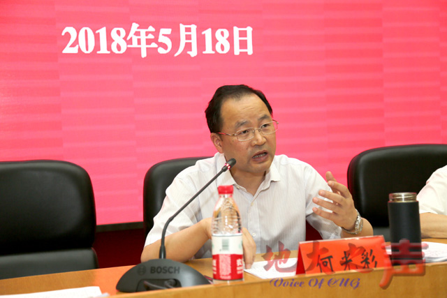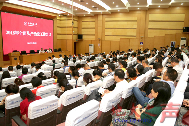 (地大之声记者刘妍慧 摄影屠傲凌)5月18日,我校在迎宾楼报告厅召开2018年全面从严治党工作会议。在校校领导,校党委委员、纪委委员,全校中层干部,各二级党组织纪委书记、纪检委员参加会议。校长王焰新主持会议。