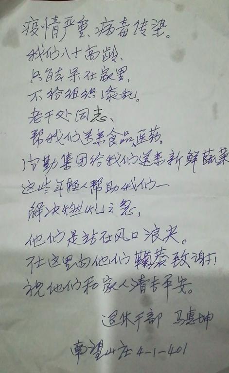 2月29日,离退休干部处处长陈文武收到家住南望山庄85岁马惠坤老师给应急突击队的感谢信。当天,张松、胡书林、黄蒙老师,帮马老师买到了急需的生活物资和药品。