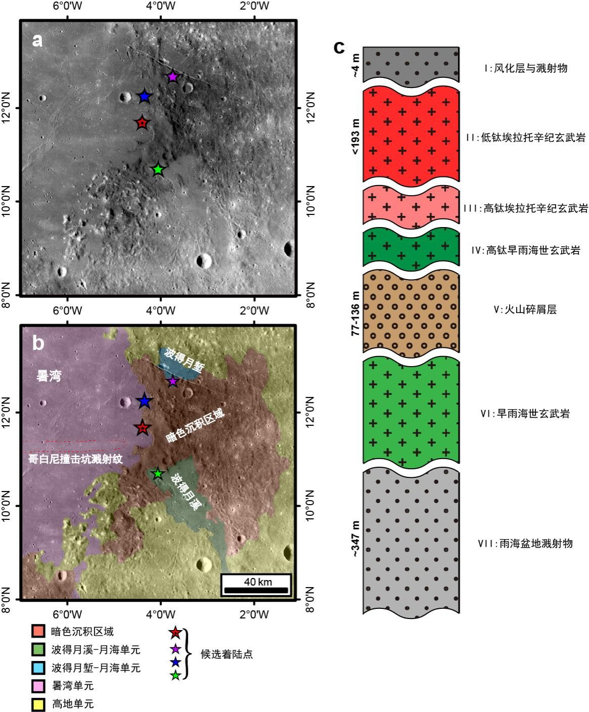 图1波得月溪群区域位置与地层情况。(a)波得月溪群区域及建议着陆点示意图。底图为嫦娥一号高程数据绘制的月球正面地形图。(b)研究区的地质单元划分。(c)波得月溪群区域暑湾单元地层柱状图。